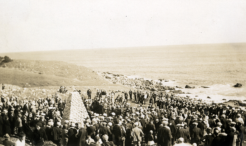 Item is a photograph of a group of people surrounding a cairn that was erected at Kennington Cove, with a naval honor guard standing along the shore.