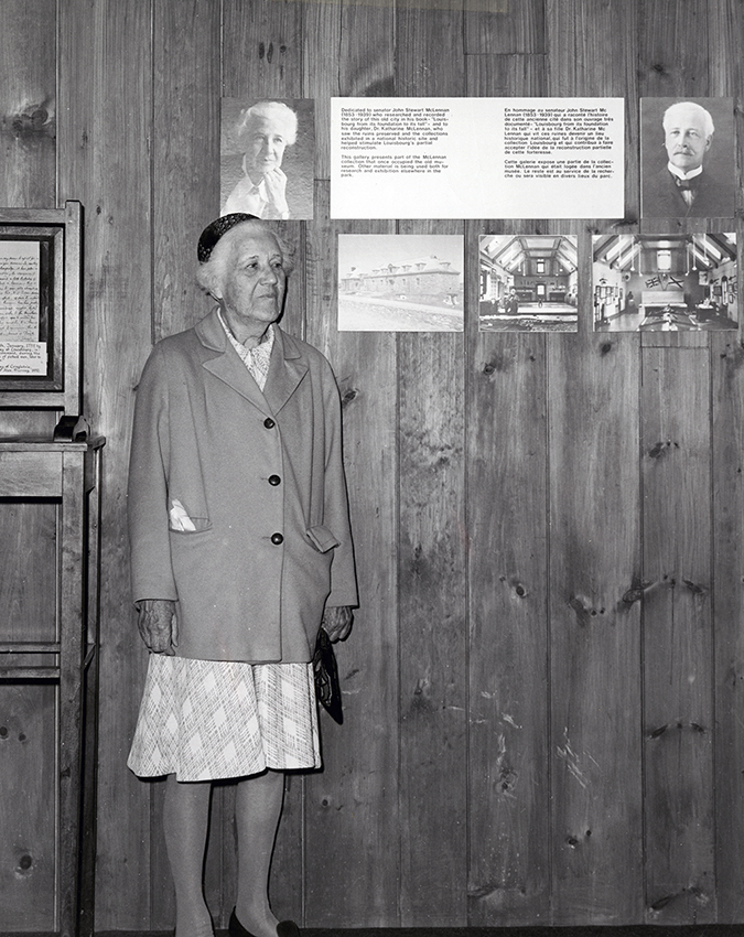 Item is a photograph of Katharine McLennan at Louisbourg. She is standing next to a plaque that commemorates the work that she and her father did to stimulate the partial reconstruction of the Fortress, preserve its history, and construct exhibits for the benefit of visitors to the site.