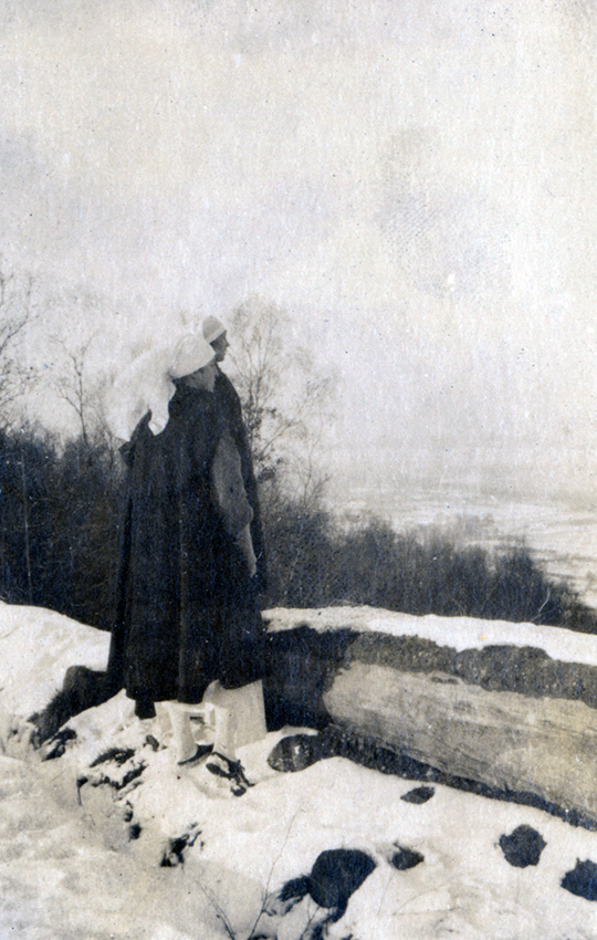 Item is a photograph of a pair of unidentified nurses on the observatoire near H.O.E. 18, S.P. 118 in Vasseny, France, looking towards the Fort de la Malmaison.