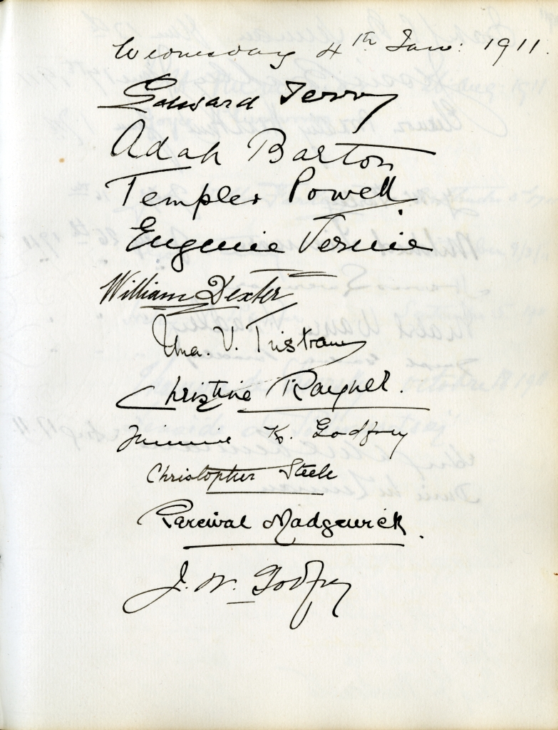 Item is the guestbook that was used at the Petersfield Estate, and later by Katharine at events on her home on Whitney Avenue, Sydney. In fact, Petersfield is most famous and historically interesting because of the guests who stayed there. Besides frequent local visitors like Hetty Kimber and her brother Fred, Shirley Davidson, the Burchells, the Sutherlands, the Grosvenors and visiting family members, the estate boasted visitors of international renown.