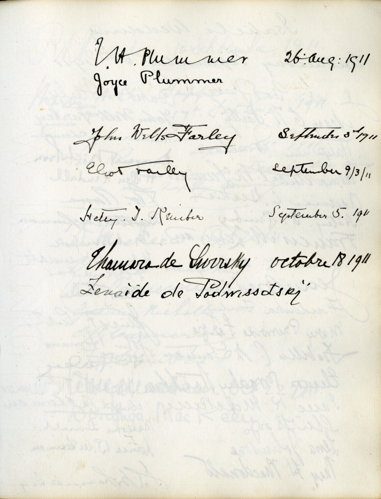 Item is the guestbook that was used at the Petersfield Estate, and later by Katharine at events on her home on Whitney Avenue, Sydney. In fact, Petersfield is most famous and historically interesting because of the guests who stayed there. Besides frequent local visitors like Hetty Kimber and her brother Fred, Shirley Davidson, the Burchells, the Sutherlands, the Grosvenors and visiting family members, the estate boasted visitors of international renown.