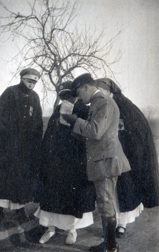 Item is a photograph of a group of unidentified nurses asking a friend soldier for directions to Vailly, France. The group of nurses were traveling companions of Katharine McLennan, and were volunteering their services as nurses to the cause at H.O.E. 18, S.P. 118.