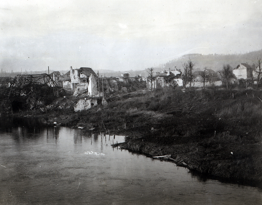 Item is a photograph of destruction along the waterfront in Vailly, France. Katharine McLennan, who had in the early war years photographed the beauty of rural France, captured a series of photographs showing the devastation that the War had caused in locations near her posting in Vasseny.