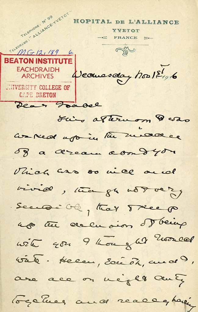 Item is a letter from Katharine McLennan to Isabel Farley, dated 1 November 1916. In the letter, Katharine describes her hatred for night duty, especially in cold, windy weather, and day-to-day operations at the hospital. She also writes about how excited she is to have received a casque with two bullet holes in it from one of the men that was leaving the hospital, and how she will be switching houses when she comes off night duty.