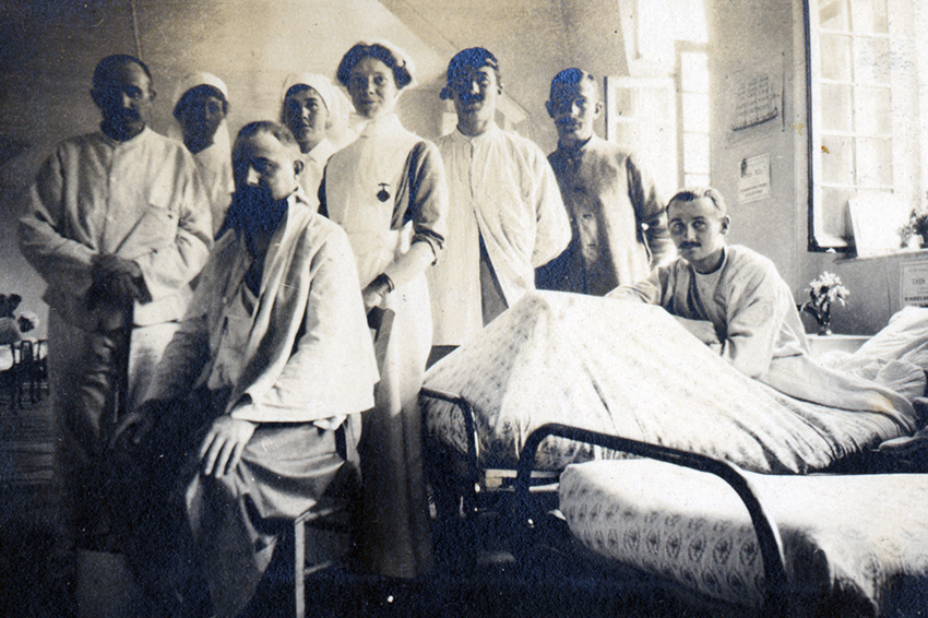 Item is a photograph of members of the staff at the Hôpital de l'Alliance posing with some patients inside the hospital. Featured in the photograph is Katharine McLennan (4th from left), Sister Young (5th from left), Olivier (2nd from right), and Harnois (far right). Both Olivier and Harnois allowed Katharine to sketch them during their time at the hospital.