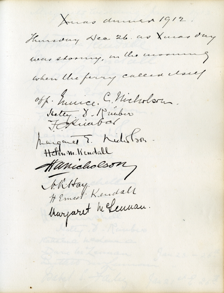 Other notable pages in the guestbook include Isabel's wedding (page 106), the tragic death of Louise McLennan in 1912 (page 109), Margaret's wedding to future Lieutenant-Governor, Dr. Henry Ernest Kendall (page 113), the deaths of both son Hugh and J.S.'s brother Bart in battle during World War I (page 126). J.S. McLennan's death is noted in an elegant tribute written by Katharine on page 162.