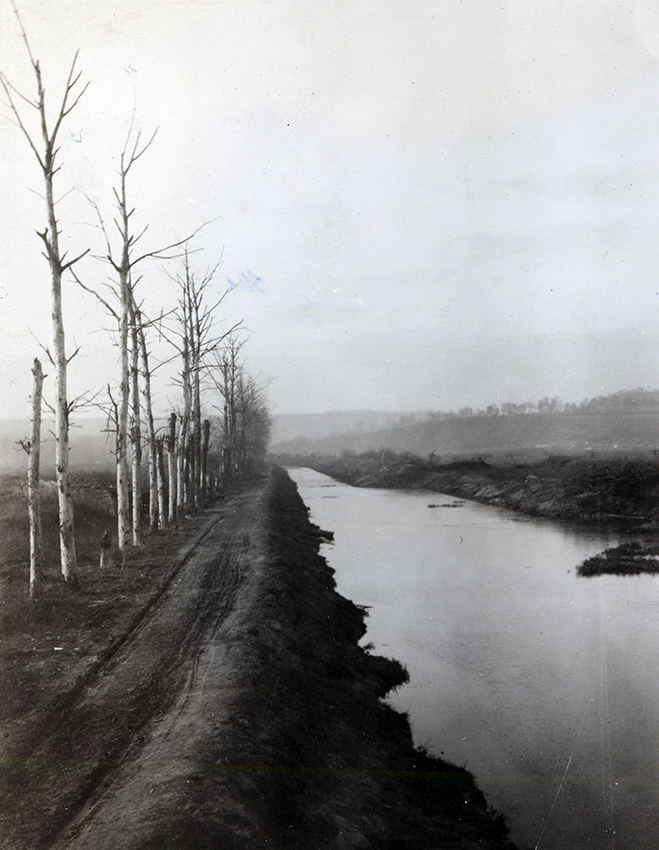 Item is a photograph of destruction along a river in France. Katharine McLennan, who had in the early war years photographed the beauty of rural France, captured a series of photographs showing the devastation that the War had caused in locations near her posting in Vasseny.