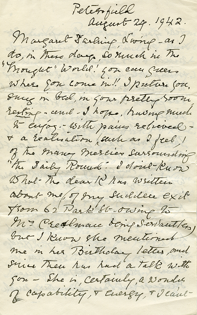 Item is a letter written by Hetty Kimber to Margaret Kendall. The letter is addressed from Petersfield.