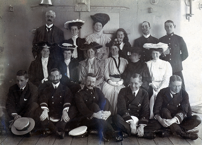 Item is a photograph of the McLennan family and guests aboard the HMS Indefatigable with crew members. People found in the image include J.S. McLennan, Betty McLennan, Molly Plummer, Katharine McLennan, Isabel McLennan, Patty McLennan, Louise Bradley McLennan, and Mrs. Nash.