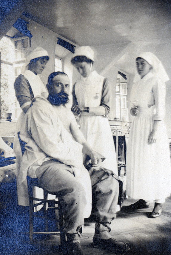 Item is a photograph of nurses at the Hôpital de l'Alliance in Yvetot, France, tending to a patient identified as "Little Stephen." In addition to Little Stephen, Sister Young (2nd from right) and Katharine McLennan (far right) are identified in the image.