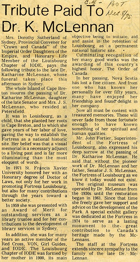 Item is clipping of an article about the life of Katharine McLennan by Dorothy Sutherland, written in tribute to Katharine after her death in December 1975.