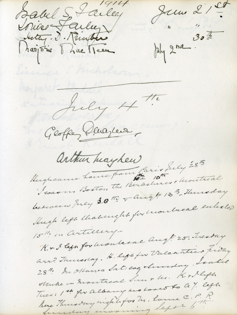 Other notable pages in the guestbook include Isabel's wedding (page 106), the tragic death of Louise McLennan in 1912 (page 109), Margaret's wedding to future Lieutenant-Governor, Dr. Henry Ernest Kendall (page 113), the deaths of both son Hugh and J.S.'s brother Bart in battle during World War I (page 126). J.S. McLennan's death is noted in an elegant tribute written by Katharine on page 162.