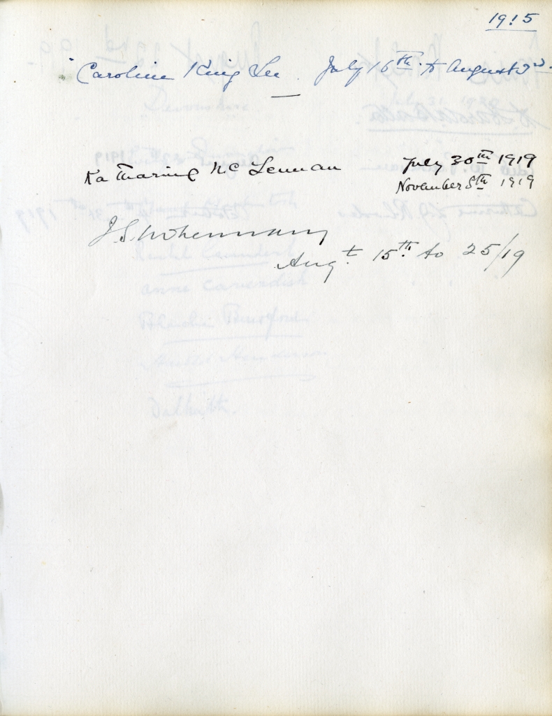 Item is the guestbook that was used at the Petersfield Estate, and later by Katharine at events on her home on Whitney Avenue, Sydney. In fact, Petersfield is most famous and historically interesting because of the guests who stayed there. Besides frequent local visitors like Hetty Kimber and her brother Fred, Shirley Davidson, the Burchells, the Sutherlands, the Grosvenors and visiting family members, the estate boasted visitors of international renown.