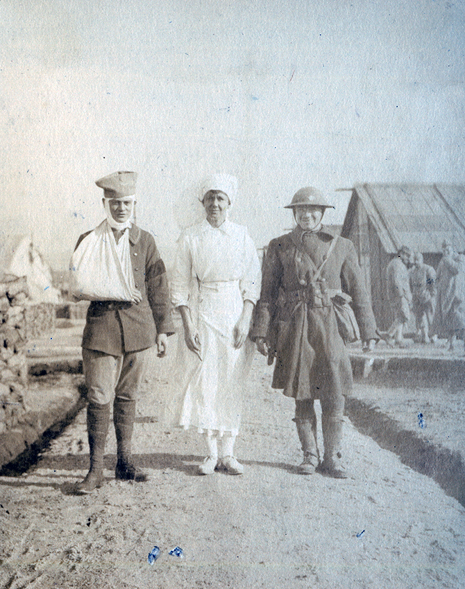 Item is a photograph of Helen Homans posing with soldiers Bamboula and Piasseehi outside the H.O.E. 18, S.P. 118 in Vasseny, France.