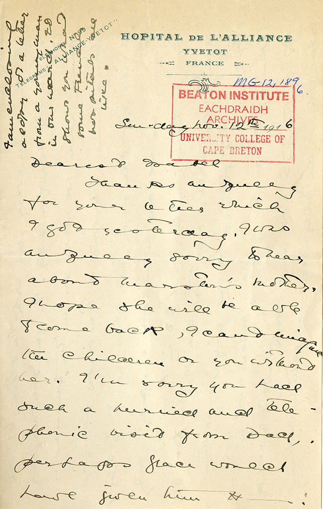 Item is a letter from Katharine McLennan to Isabel Farley, dated 12 November 1916. In the letter, Katharine describes her hatred of night duty and the schedule that night duty nurses must follow. She also mentions a concert held at the hospital, featuring a song that she describes as "perfectly disgusting," and the arrival of a new doctor from London, Major Robson.