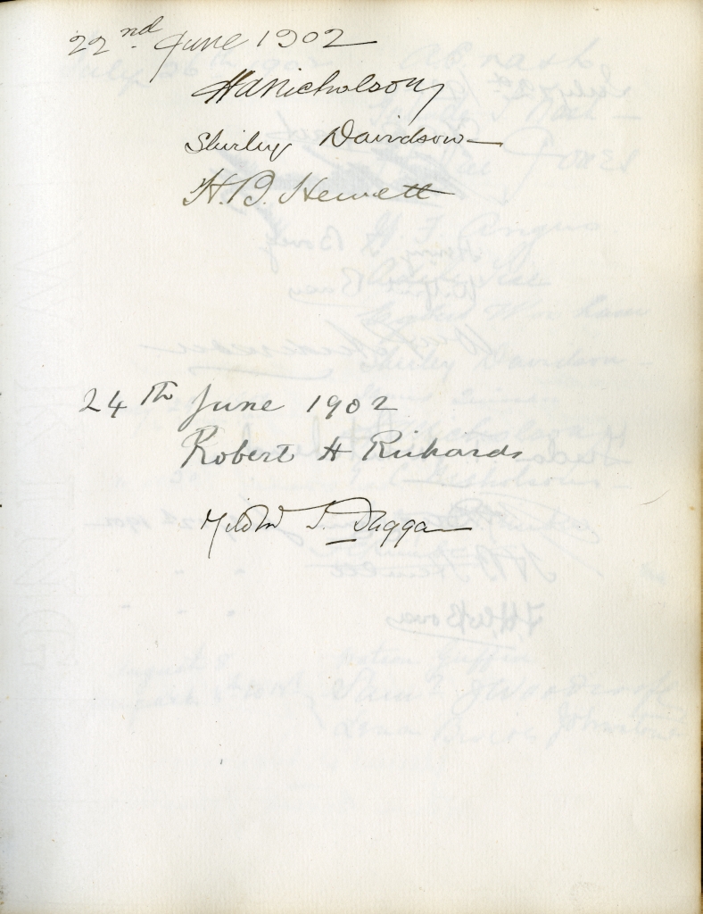 Item is the guestbook that was used at the Petersfield Estate, and later by Katharine at events on her home on Whitney Avenue, Sydney. In fact, Petersfield is most famous and historically interesting because of the guests who stayed there. Besides frequent local visitors like Hetty Kimber and her brother Fred, Shirley Davidson, the Burchells, the Sutherlands, the Grosvenors and visiting family members, the estate boasted visitors of international renown.
