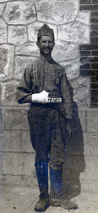 Item is a photographic portrait of an unidentified soldier in uniform with his hand in a cast. The photo is part of a series of portraits photographed by Katharine McLennan of the men whom she served and cared for during her time as a volunteer nurse in WWI.