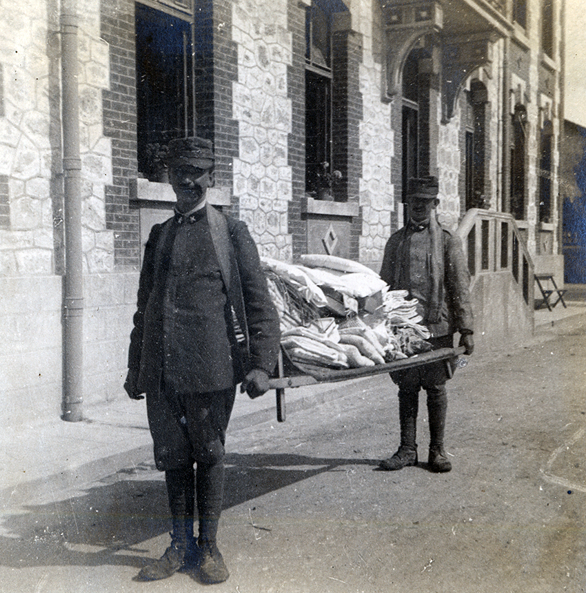 Item is a photograph of Italian orderlies working outside the hospital in Pontoise, France.