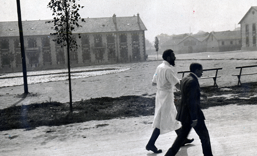 Item is a photograph of Drs. Mulier and Duval walking across the grounds of the hospital in Pointoise, France.