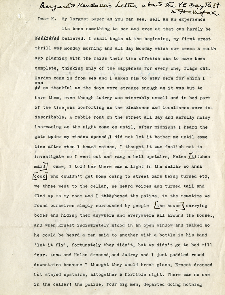 Item is a draft of a written account of the Halifax V-E Day Riots by Margaret Kendall to her sister Katharine McLennan. Margaret's husband, Henry Ernest Kendall, was serving as Lieutenant Governor of Nova Scotia at the time.
