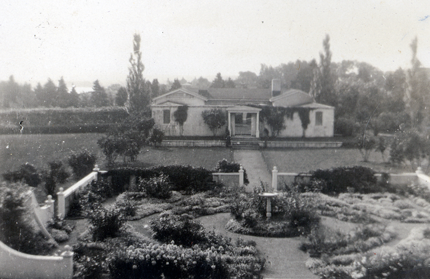 Item is a photograph of the studio and rose garden at the Petersfield estate, taken by Katharine McLennan.