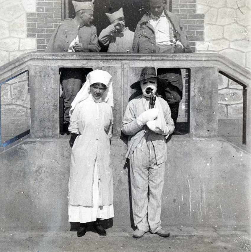 Item is a photograph of nurse Miss Wood standing outside the hospital in Pontoise, France with several patients.