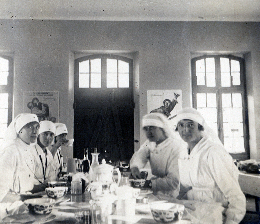 Item is a photograph of a group of nurses, including Mlle. Brolemann, Edith Parkman, and Helen Homans in the hospital in Pontoise, France.