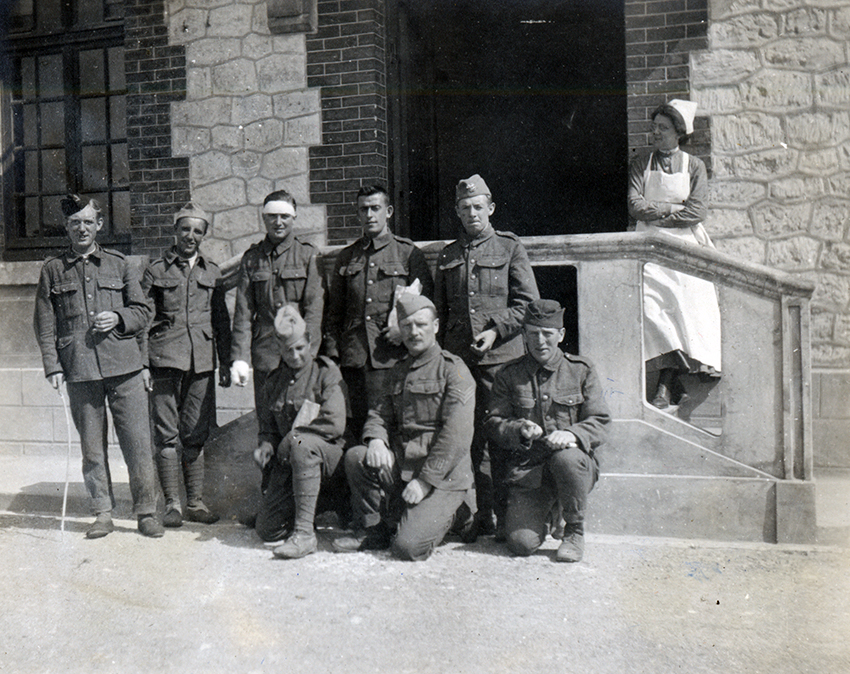 Item is a photograph of a group of English patients standing outside the hospital in Pontoise, France. Also in the photograph is an unidentified American nurse.