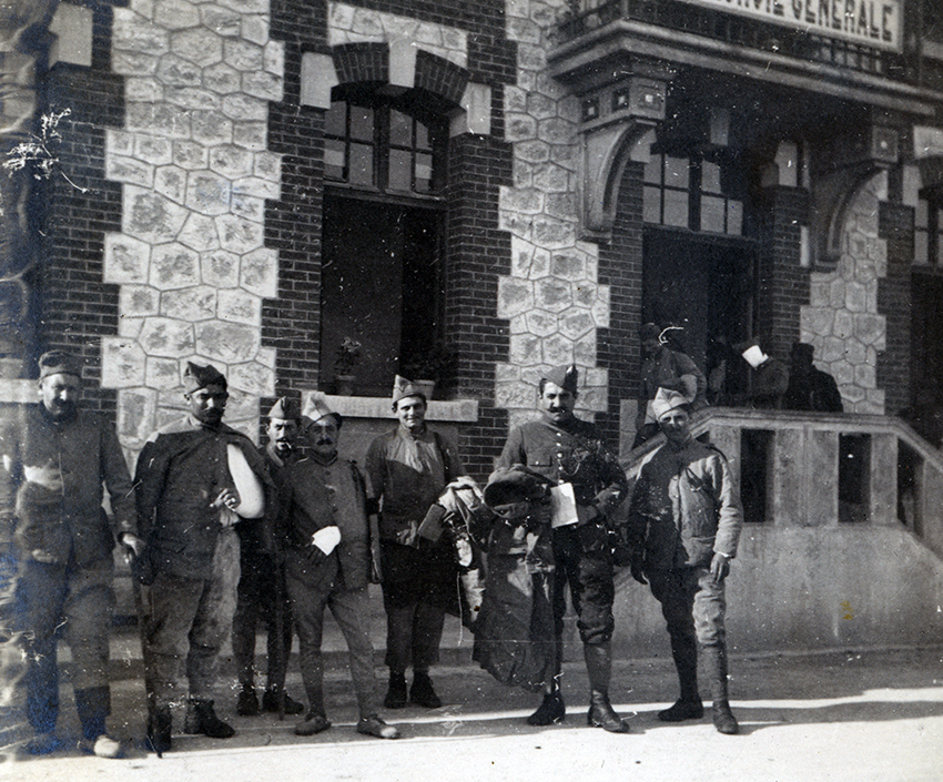 Item is a photograph of a group of patients standing outside the hospital in Pontoise, France, waiting to be evacuated. Katharine McLennan took many photographs of patients that she cared for during her time as a WWI nursing volunteer.