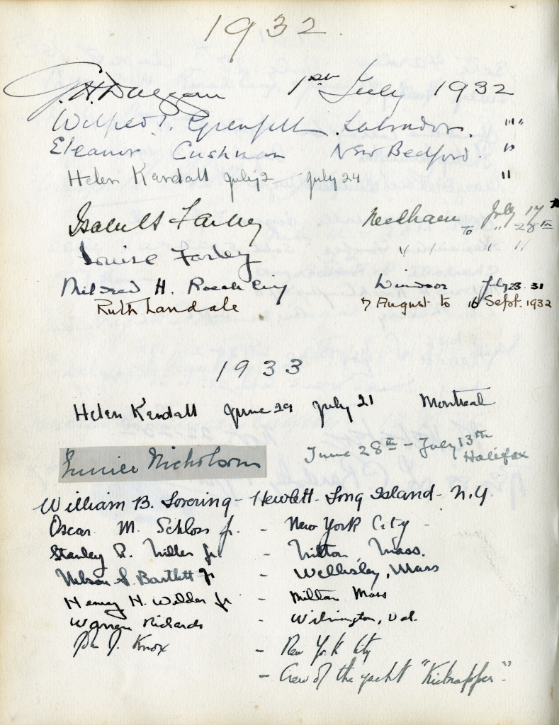 Prime Minister Robert Borden and future Prime Minister Arthur Meighen visited Petersfield in 1911 and 1914 respectively. British Prime Minister Ramsay MacDonald also paid a call on J.S. at Petersfield (page 149). Governors-General Byng (page 137), Wellington, and Tweedsmuir all visited Petersfield. Lord and Lady Baden-Powell stayed at Petersfield and Katharine subsequently became very involved with the Guiding movement in Cape Breton. The poet, Sir Charles G.D. Roberts and the musical group the Hart House Quartet (pages 150, 153) were guests. Canadian historians D.C. Harvey and J.C. Webster, along with aviation engineer Frederick Walker "Casey" Baldwin (pages 146, 136) were honoured guests. Lord Grey and Admiral and Lady Kingsmill visited J.S. at Petersfield. Another famous visitor was Sir Wilfred Grenfell of the Grenfell Mission of Labrador who was a favorite of Katharine's.