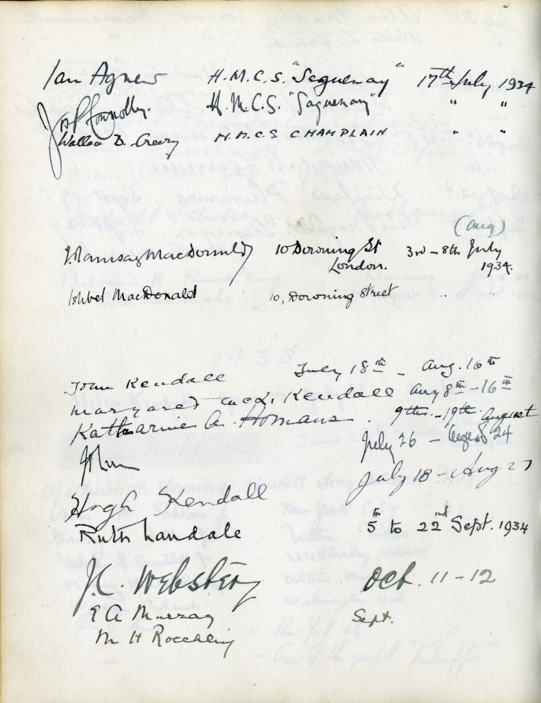 Item is the guestbook that was used at the Petersfield Estate, and later by Katharine at events on her home on Whitney Avenue, Sydney. In fact, Petersfield is most famous and historically interesting because of the guests who stayed there. Besides frequent local visitors like Hetty Kimber and her brother Fred, Shirley Davidson, the Burchells, the Sutherlands, the Grosvenors and visiting family members, the estate boasted visitors of international renown.