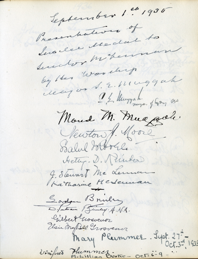 Other notable pages in the guestbook include Isabel's wedding (page 106), the tragic death of Louise McLennan in 1912 (page 109), Margaret's wedding to future Lieutenant-Governor, Dr. Henry Ernest Kendall (page 113), the deaths of both son Hugh and J.S.'s brother Bart in battle during World War I (page 126). J.S. McLennan's death is noted in an elegant tribute written by Katharine on page 162.