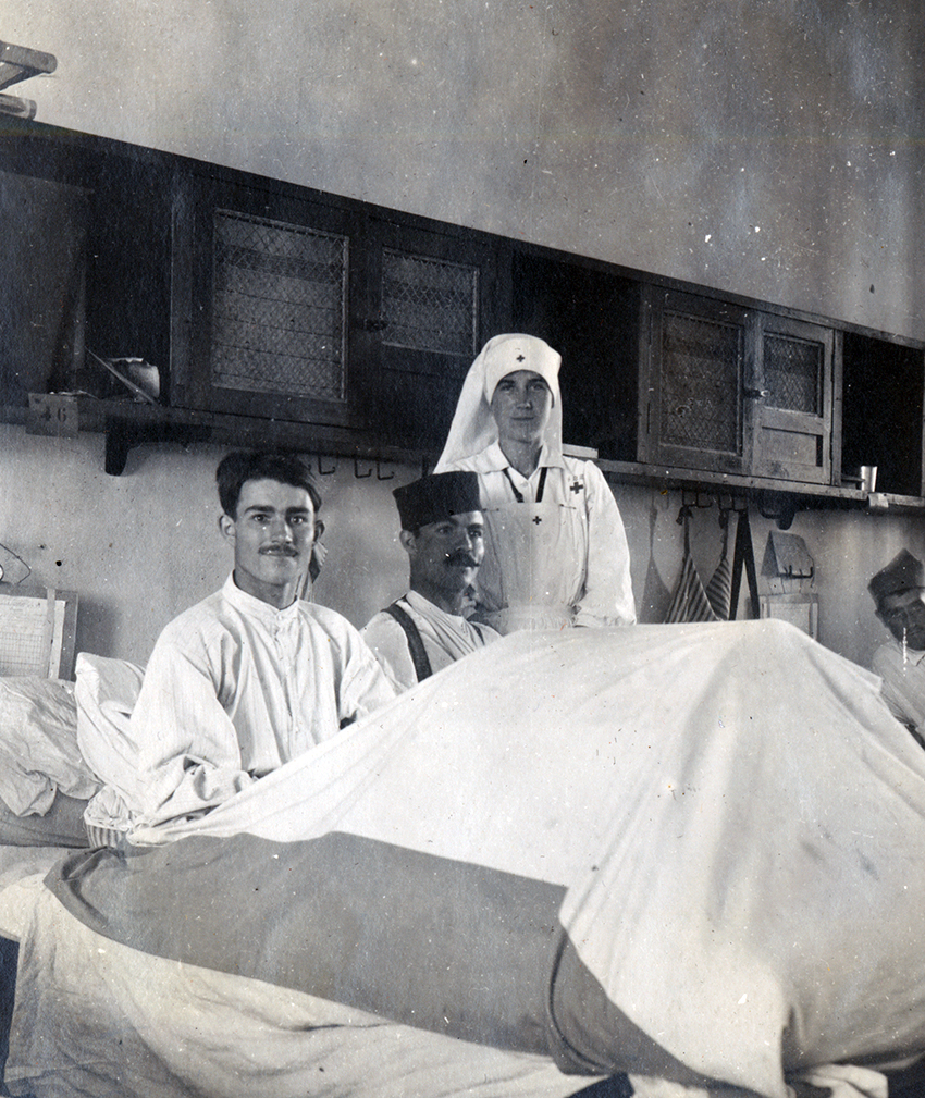 Item is a photograph of Katharine McLennan posing with patient Delasalle and an unknown man at the hospital in Pontoise, France. Katharine took several photos of Delasalle during the time in which he was in her care, including an image of Delasalle with his family and one of his leg, which was plagued with a severe infection.
