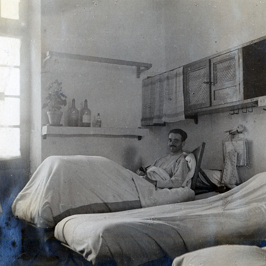 Item is a photograph of patient Villeneuve at the hospital in Pontoise, France. Throughout the entirety of her time spent volunteering abroad, Katharine captured images of the men whom she cared for.
