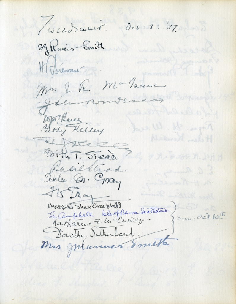 Item is the guestbook that was used at the Petersfield Estate, and later by Katharine at events on her home on Whitney Avenue, Sydney. In fact, Petersfield is most famous and historically interesting because of the guests who stayed there. Besides frequent local visitors like Hetty Kimber and her brother Fred, Shirley Davidson, the Burchells, the Sutherlands, the Grosvenors and visiting family members, the estate boasted visitors of international renown.
