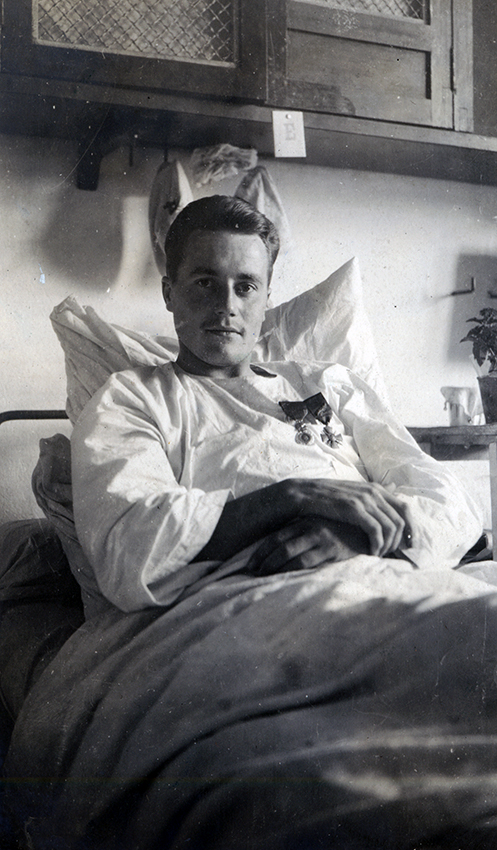 Item is a photograph of an unidentified patient wearing medals in a ward at the hospital in Pontoise, France. Throughout the entirety of her time spent volunteering abroad, Katharine captured images of the men whom she cared for.