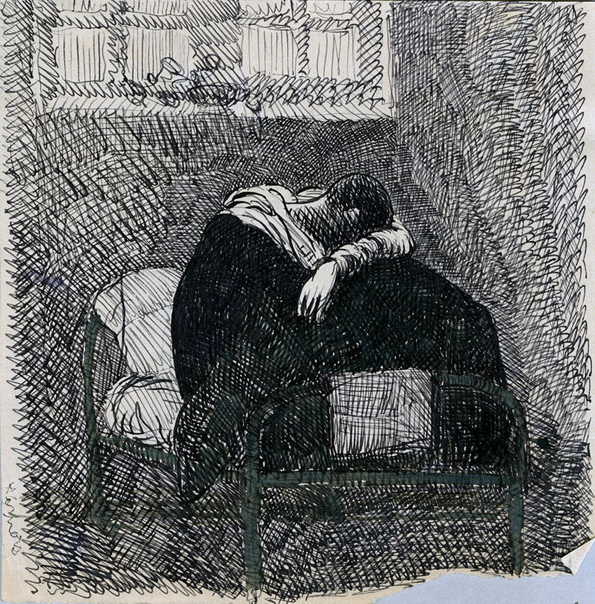 Item is a drawing of wounded soldier, Harnois, as drawn by Katharine McLennan in 1916. Katharine completed this drawing while on night duty as a Red Cross volunteer at the Hôpital de l'Alliance in Yvetot, France.