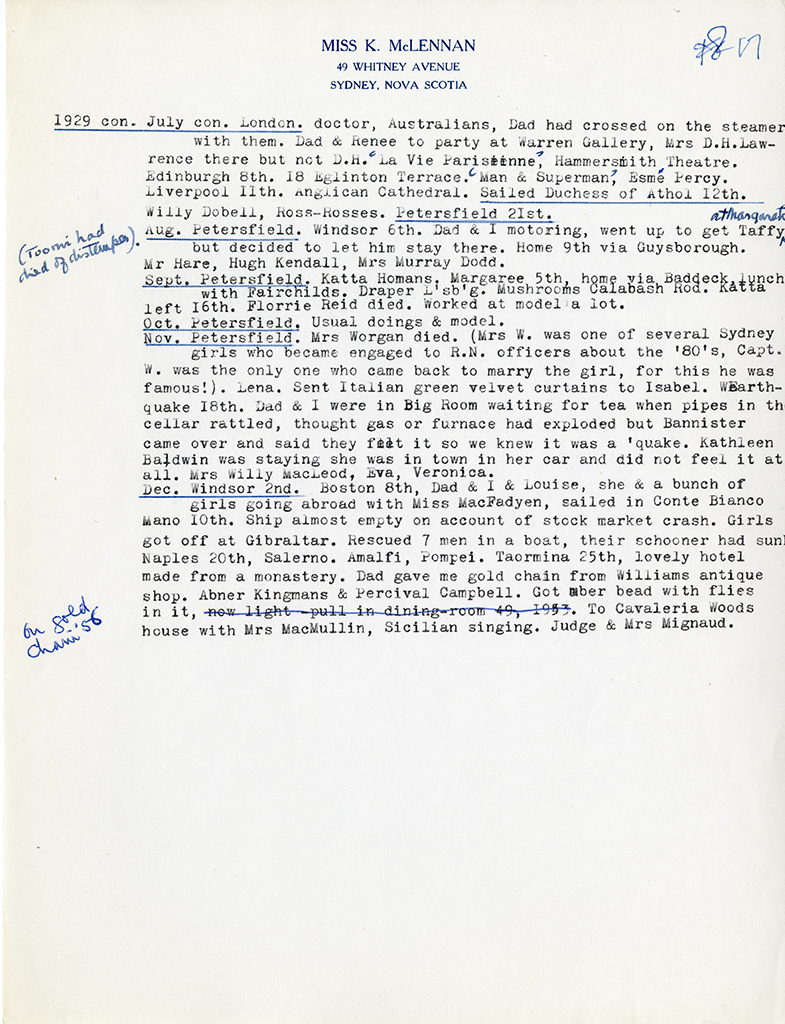 Item is a typed partial-transcription of Katharine McLennan's diaries from 1909-1952. Entries focus on important moments in Katharine's life, including her time spent in Europe as a girl and young adult, her trip west by car in 1927, and her work for both the Red Cross blood donor clinic and the Louisbourg Museum. The diary entries demonstrate how full and active her life was, and how involved she was in her community projects. The original copies of the diaries were burned by Katharine after she made these transcriptions.