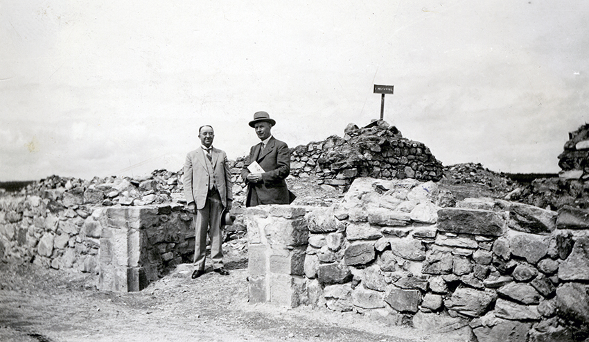 Item is a photograph of Dr. Morrison and a Mr. Milner posing inside the ruins of one of the buildings at Louisbourg.