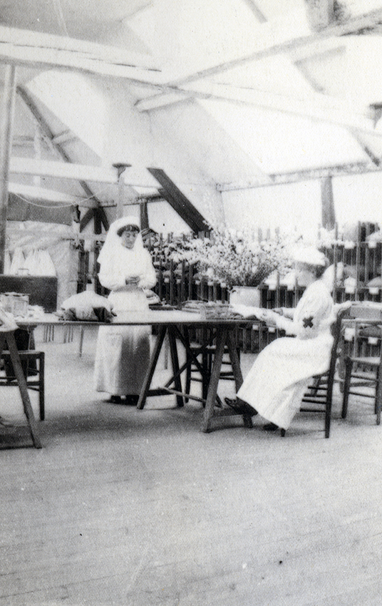 Item is a photograph of nurses at the Hôpital de l'Alliance in Yvetot, France arranging wildflowers in the vestiaire. The nurses were identified by photographer Katharine McLennan as Mrs. Linkhorn and Evelyn O'Connor.
