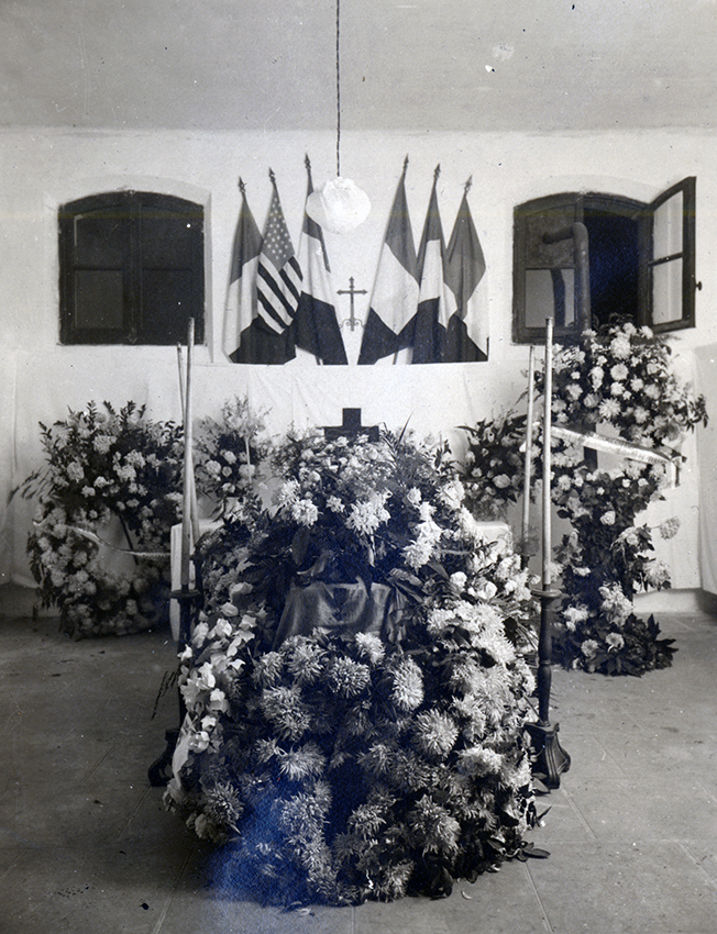 Item is a photograph of the coffin of Helen Homans, who died of influenza while volunteering as a nurse at the hospital in Pontoise, France, the 5 November, 1918, only a week before the armistice. Helen was a close friend of Katharine McLennan, and the two had experienced the war together, both volunteering at the same hospitals and taking many day trips to the French countryside together. The amount of care that was taken in arranging Helen's coffin is visible, with many elaborate flower arrangements assembled by mourners.