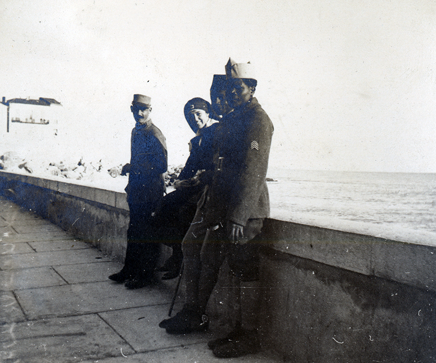 Item is a photograph of Edith Parkman posing with unidentified soldiers in Menton, France. Katharine McLennan and Edith frequently traveled together during the time that they volunteered as nurses during WWI.