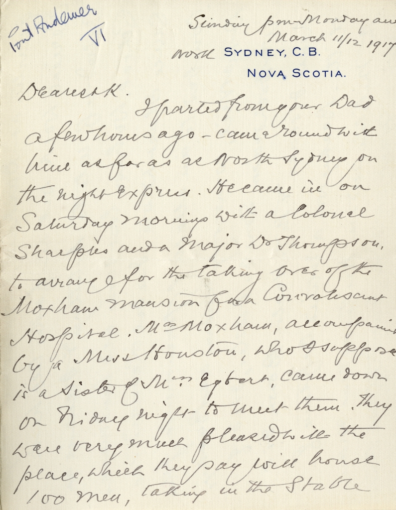 Item is a letter from F.C. Kimber sent to Katharine McLennan during her time serving with the Red Cross during World War I. The letter focuses on an assortment of topics including the re-purposing of Moxham Mansion into a convalescent hospital and the role that Katharine's father J.S. played in that endeavor.