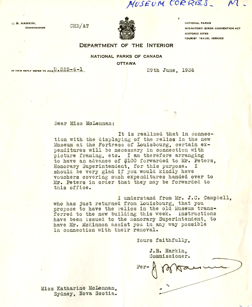 Item is a letter from J.B. Harkin, Commissioner of the Canadian Department of the Interior, to Katharine McLennan regarding an advance of $100 being sent for picture framing at the Louisbourg Museum.