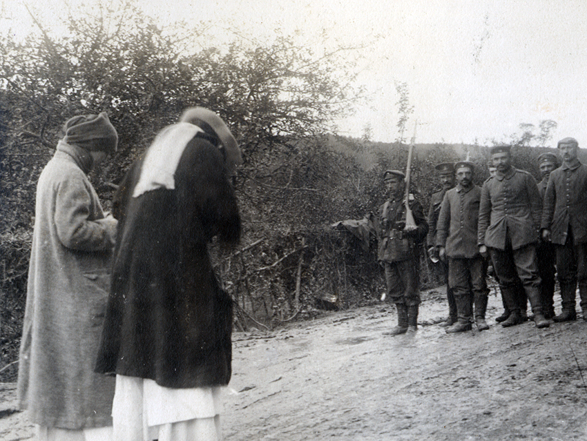 Item is a photograph of Edith H. and Helen Homans taking a photograph of a group of German prisoners of war. Helen, a friend of Katharine McLennan, was a gifted photographer and contributed many images to Katharine's collection of WWI photographs.