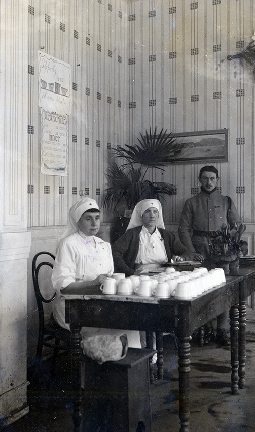 Item is a photograph of Madame Sirot, Katharine McLennan, and an unidentified sergeant working at the canteen in a hospital in Langenschwalbach, Germany.