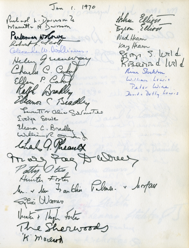 Item is the guestbook that was used at the Petersfield Estate, and later by Katharine at events on her home on Whitney Avenue, Sydney. In fact, Petersfield is most famous and historically interesting because of the guests who stayed there. Besides frequent local visitors like Hetty Kimber and her brother Fred, Shirley Davidson, the Burchells, the Sutherlands, the Grosvenors and visiting family members, the estate boasted visitors of international renown.