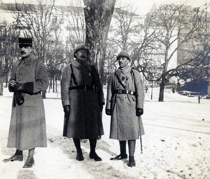 Item is a photograph of Repesse and two unknown men who had just been decorate, in uniform, in Langenschwalbach, Germany. Katharine McLennan, photographer, captured many images of servicemen that she encountered during her time as a WWI nursing volunteer.