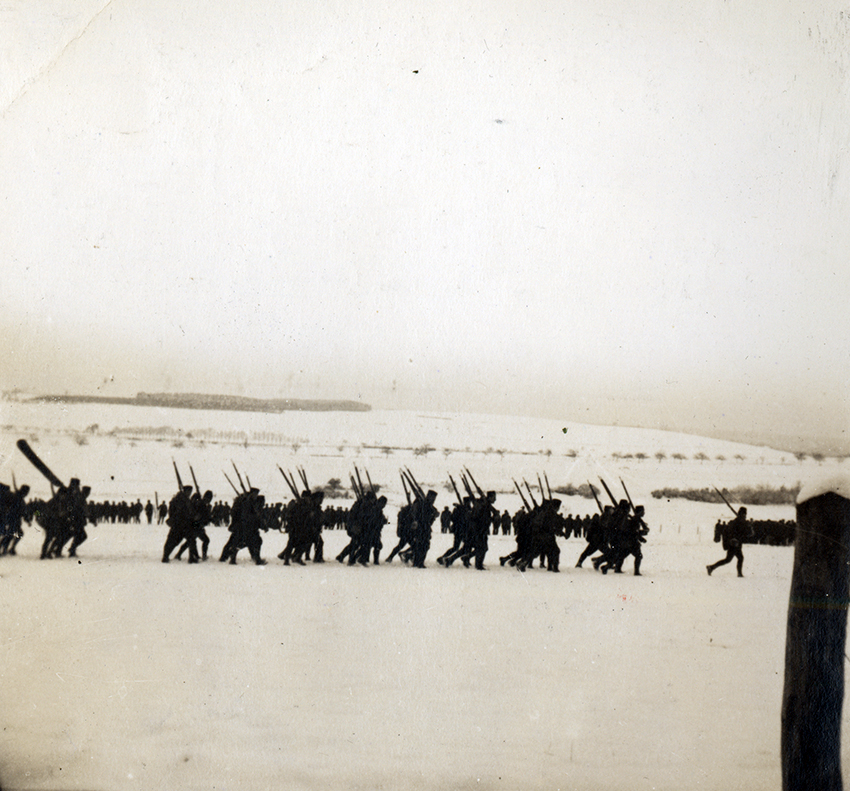 Item is a photograph of a group of soldiers marching at the decoration of the flag of the Tiraillieurs.