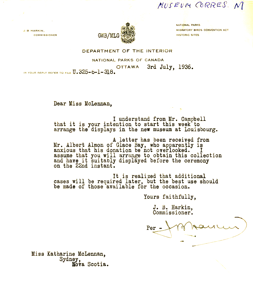 Item is a letter from J.B. Harkin, Commissioner of the Canadian Department of the Interior to Katharine McLennan regarding a donation made by Mr. Albert Almon of Glace Bay to the Louisbourg Museum. Mr. Almon had contacted the Department of the Interior in concern that his donation had been overlooked.
